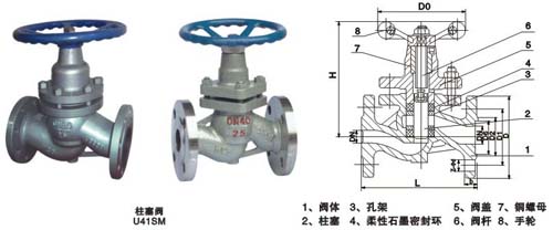 柱塞閥是由閥體、閥蓋、閥桿、柱塞、孔架、密環、手輪等零件組成(如圖)。當手輪旋轉時,通過閥桿帶動柱塞在孔架中間上下往復運動來完成閥門的開啟與關閉功能。在閥門中柱塞與密封環間采用過盈配合,通過調節壓蓋中法蘭螺栓,使密封環壓縮所產品生的側向力與閥體中孔面及柱塞外圓密封,從而保證了閥門的密封性,杜絕了內泄漏、同時閥門開啟矩小、能實現閥門的迅速開啟和關閉。柱塞閥由于密封環采用回彈性強、耐磨性高的無毒新型密封材料,具有經受長期高溫、高壓而不喪失彈性,所以密封性能可靠,經久耐用。